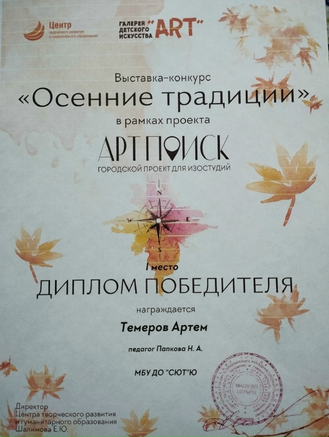 Поздравляем Темерова Артема с ПЕРВЫМ местом в творческом проекте для изо студий «Арт-поиск»! Работа Артема была представлена на выставке, которая проходила с середины ноября до 1 декабря 2025 года по адресу пр. Мира, 44, и была организована Центром творчества и развития ребенка. Конкурс «Осенние традиции» г. Красноярск в рамках проекта «Арт-поиск» — это творческое событие, направленное на раскрытие талантов участников в изобразительном искусстве. Всего в конкурсе приняли участие 5 учащихся Станции юных техников творческого объединения «Школа раннего развития», под руководством педагога направления «Оригами» Папковой Натальи Алексеевны.