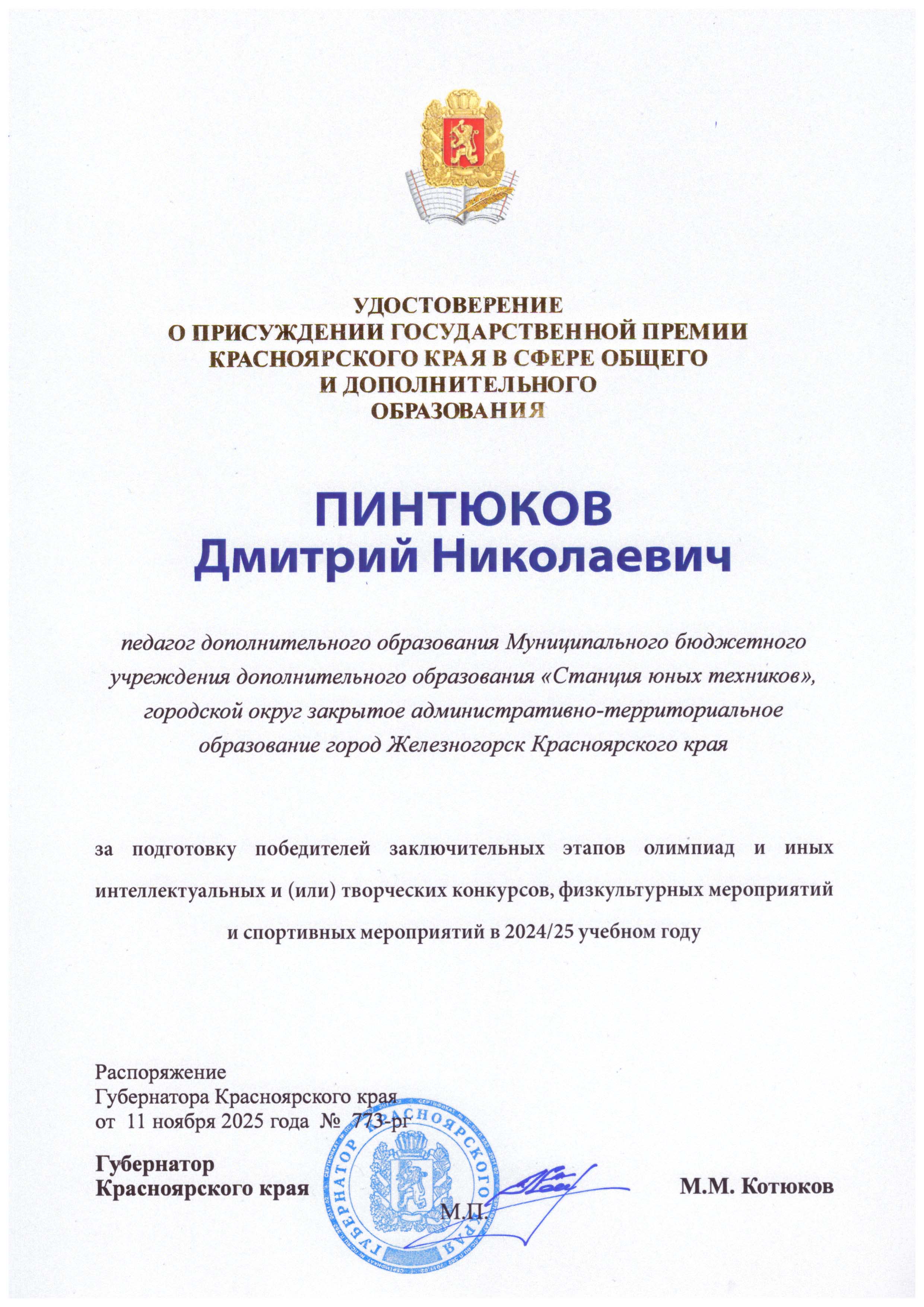В этом году премией награждены 60 учителей школ и центров дополнительного образования из разных территорий края за подготовку призеров олимпиад, интеллектуальных, творческих и спортивных конкурсов. В этом году удостоен этой награды педагог направления «Робототехника» СЮТ — Пинтюков Дмитрий Николаевич!